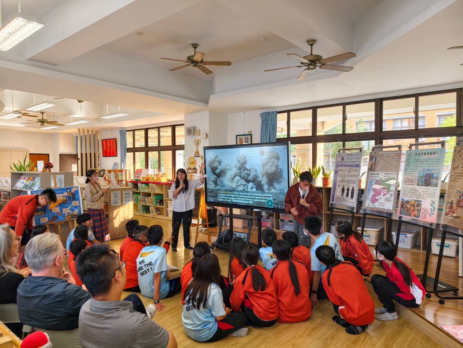 為擴大國際教育觸角,文府國中圖書館同步推出「難民主題書展」,從戰爭、逃離、收容、文化、重建等面向呈現多元觀點,引導學生透過閱讀理解全球難民議題的複雜性與人性價值。