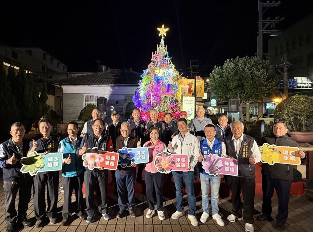 「與水共好˙綠水植藝」綠能誠信裝置藝術點燈儀式於6日晚間在后里區公所登場,最大亮點是將報廢的桌椅與后里區豐富的花卉結合,7公尺高的「綠能誠信」花卉裝置藝術。