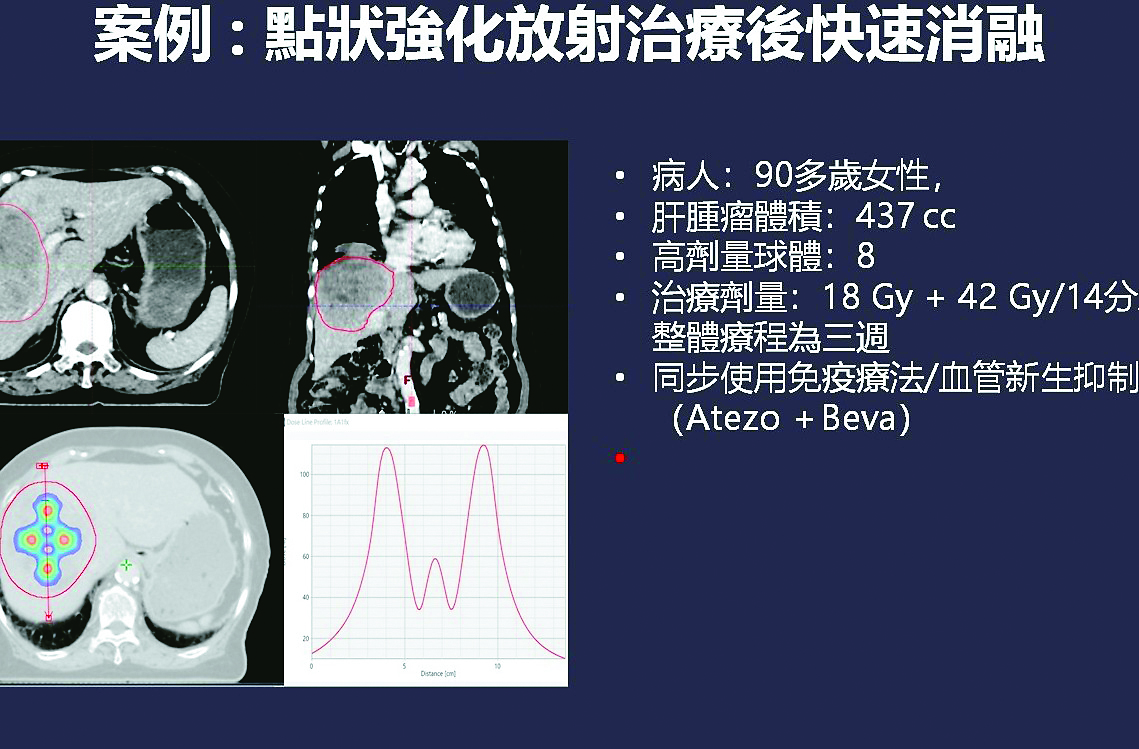 林裕為提出一個病例指出,一位90多歲的高齡肝癌病人,腫瘤體積高達460立方公分,過去治療難度高且風險高,原本擔心病人體力無法承受高強度放療,但在空間分割放療技術的協助下,能將高劑量鎖定腫瘤核心、低劑量包覆周邊,並搭配免疫治療共同進行。令人驚訝的是,治療後僅兩週影像顯示腫瘤明顯縮小,4個月後幾乎消失,病人追蹤情況良好。