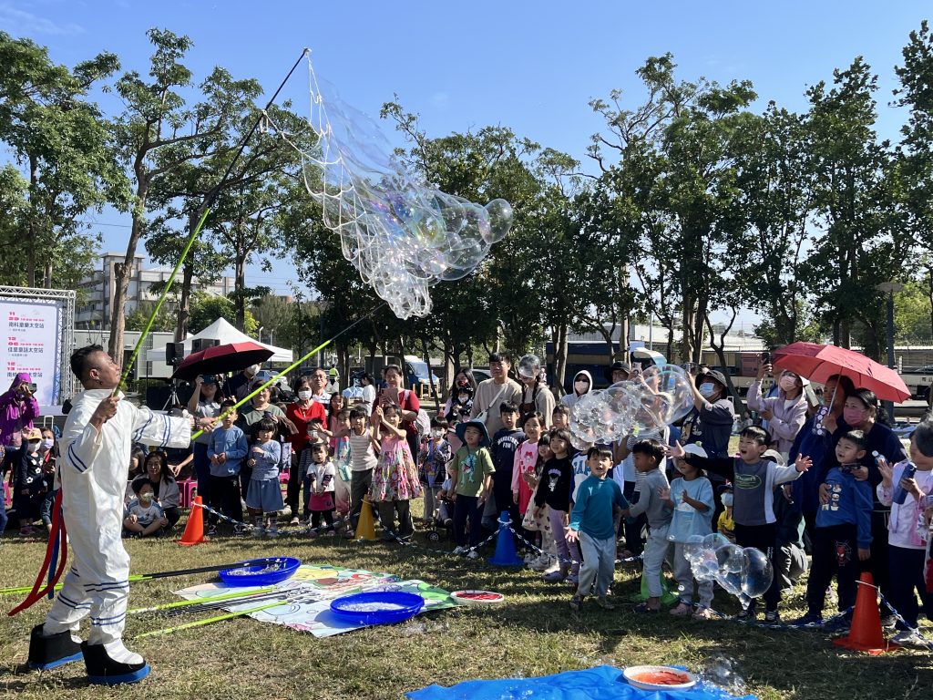 佳里的童話太空站內容相當豐富,有日本扯鈴冠軍、花式直立鈴創新者鄭湧蒼帶來令人目不暇給的精彩表演,看著鄭湧蒼玩著三顆鈴、兩副棍子的高難度特技,親子們莫不以熱烈掌聲回應;而氣球創作及泡泡派對更是全場最吸睛的亮點,小朋友追著繽紛泡泡、排隊等待專屬的造型氣球,歡笑聲處處可聞。
