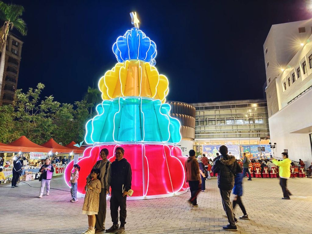 耶誕節將到來,二0二五台南耶誕燈節─新營文化中心暨綠川廊道燈區六日晚間點燈,高度十公尺,設置於新營文化中心廣場的耶誕樹取名為「雲之曙光」,設計以「雲」為核心,如同夢幻的飛行船乘著彩色雲朵而來,絢麗的耶誕樹及綠川廊道的燈飾亮起來,令人驚豔。
