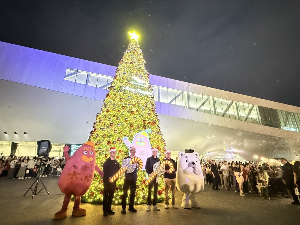 衛武營聖誕點燈於六日傍晚登場 ,華友聯董事長陸炤廷與衛武營藝術總監簡文彬、衛武營童樂節角色花露露、 華友聯Hito熊一同啟動點燈儀式,希望讓住戶與城市共享節慶氛圍,也象徵企業在地扎根 、照亮社區每個角落的初衷。