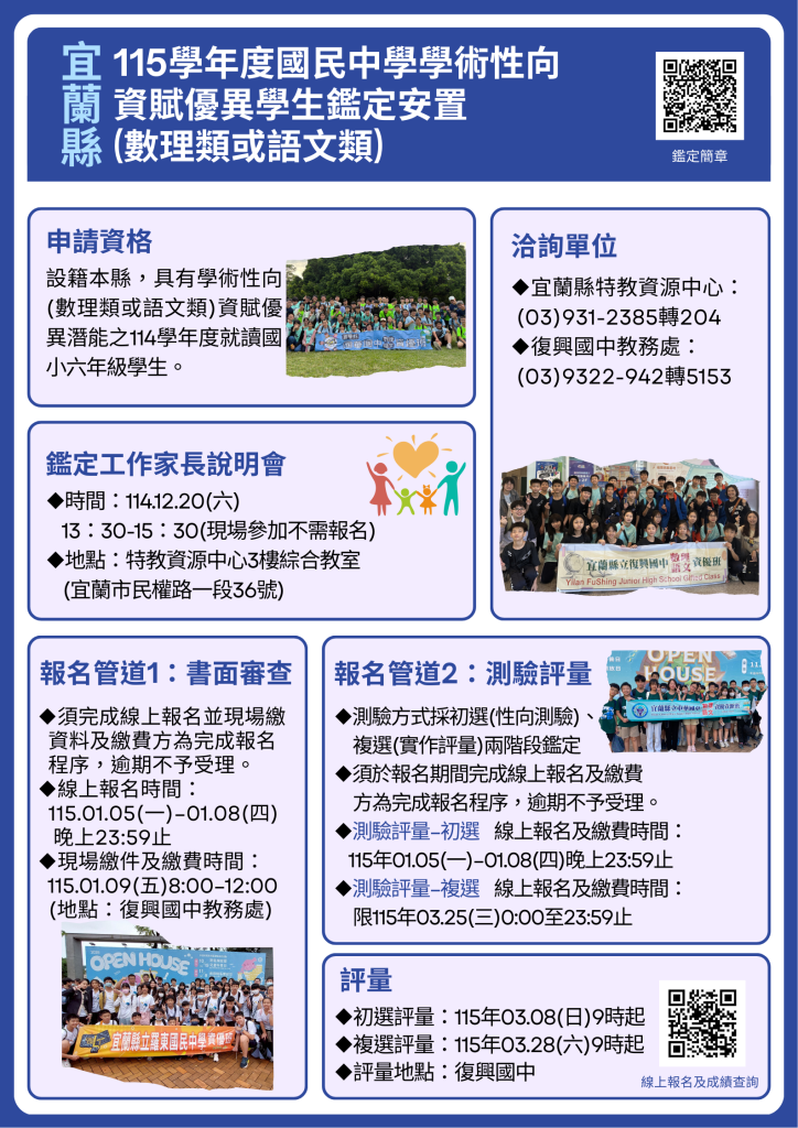 宜蘭縣政府為推動資賦優異學生適性教育,發展身心潛能,培養健全人格,增進服務社會能力,凡設籍宜蘭縣且具有學術性向(數理類或語文類)資優特質表現之一一四學年度就讀國小六年級學生,欲參加鑑定者請於明年一月五日至一月八日,逕至「宜蘭縣資優鑑定報名暨成績查詢系統」報名,並於明年三月八日至宜蘭縣立復興國民中學參加資賦優異學生鑑定初選評量。