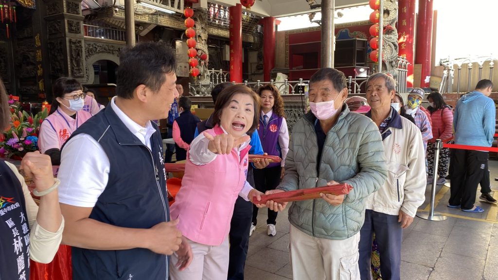 楊瓊瓔及吳呈賢、吳建德向媽祖祈求新的一年風調雨順、大家平安健康;隨後到廟埕與十多位里長合體發送一千份月曆,不到五十分鐘便被搶領一空。
