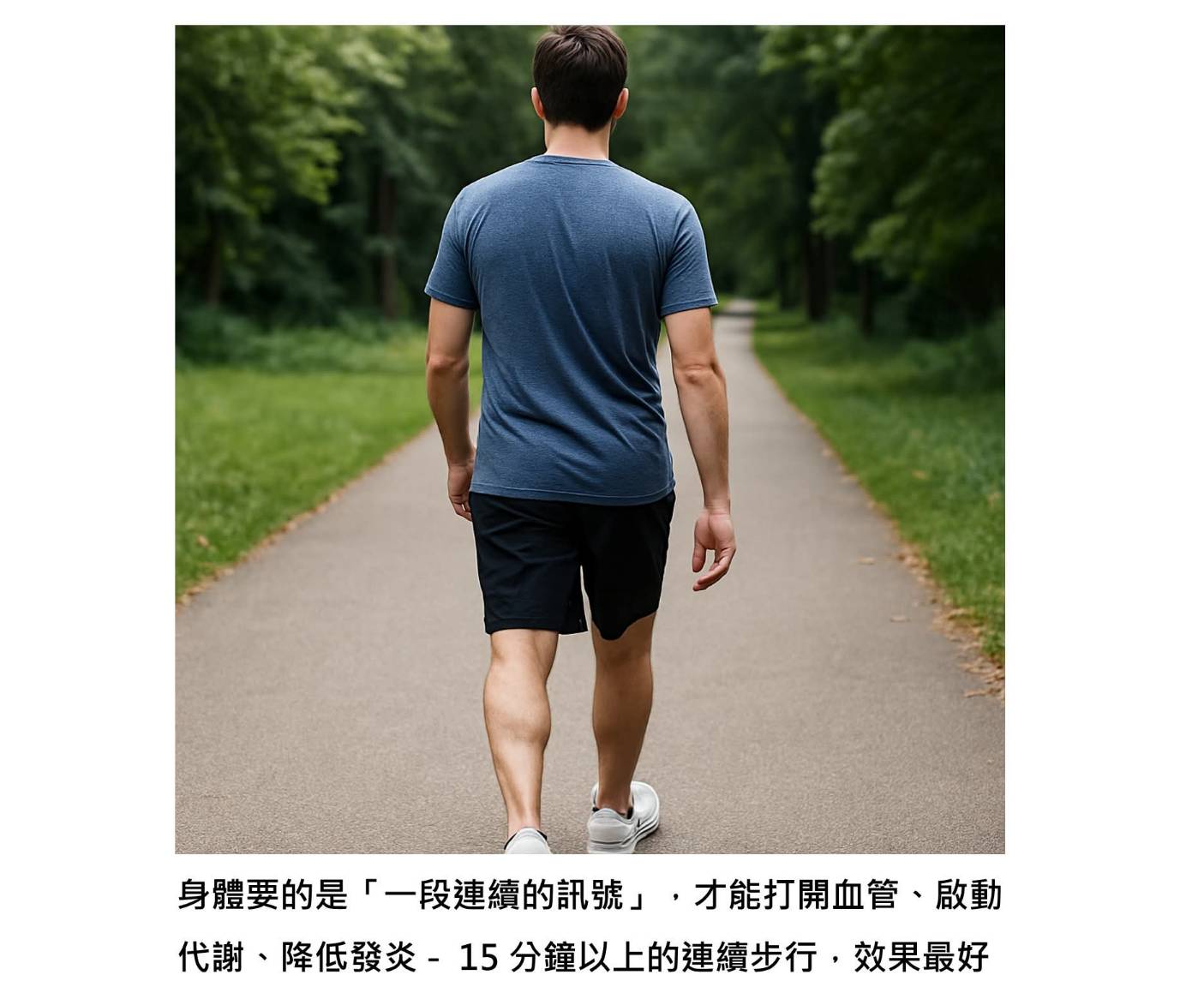 3.把「15分鐘步行」當成身體的開機鍵:這段連續步行,能讓血流變順、代謝啟動、情緒平穩,是最經濟、最溫和、卻最確實的保養方式。
