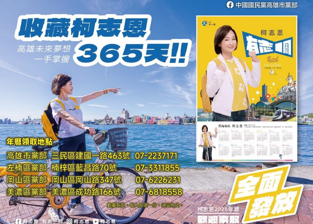 柯志恩2026年曆將於8日起,在國民黨高雄市黨部及各區聯絡處同步開放索取。數量有限,歡迎市民朋友前往領取;為避免向隅,建議前往前可先致電洽詢。