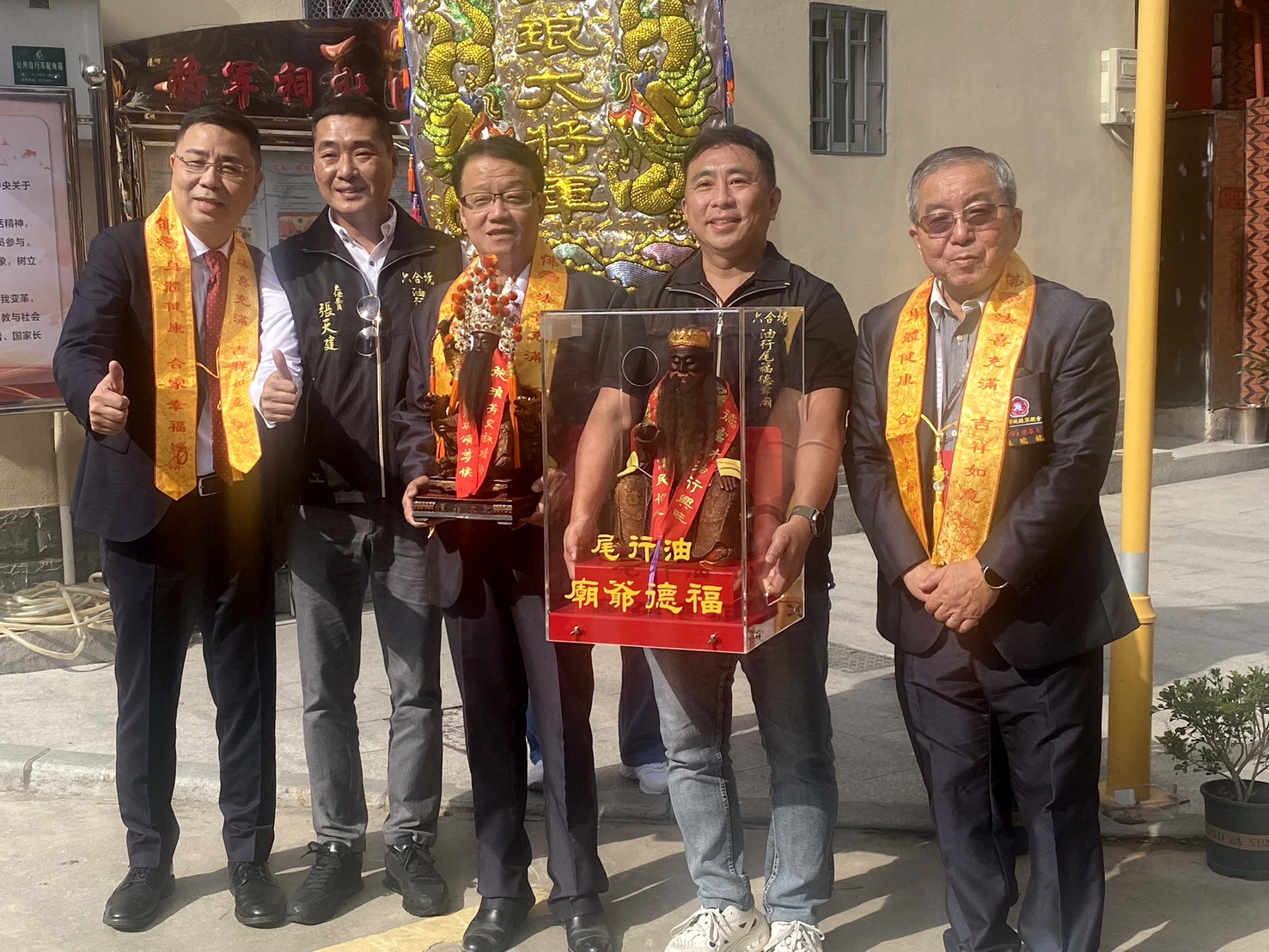 台南福德爺廟主委張天建(左二)與施姓宗親會理事長施朝桂(左三)陪同伯公仔和施琅大將軍神尊赴大陸廈門參加重光盛宴。 (記者陳俊文翻攝)
