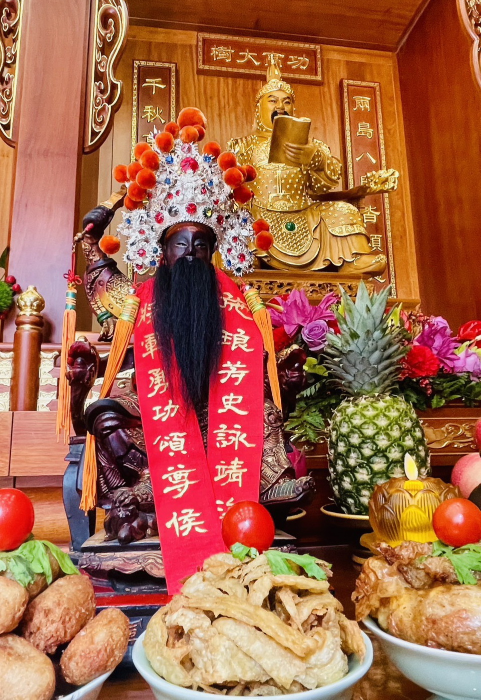 台灣福德爺廟施琅大將軍(前)與大陸廈門淨蓮寺將軍祠施琅將軍(後)同桌而坐,這樣的畫面十分難得。 (記者陳俊文翻攝)