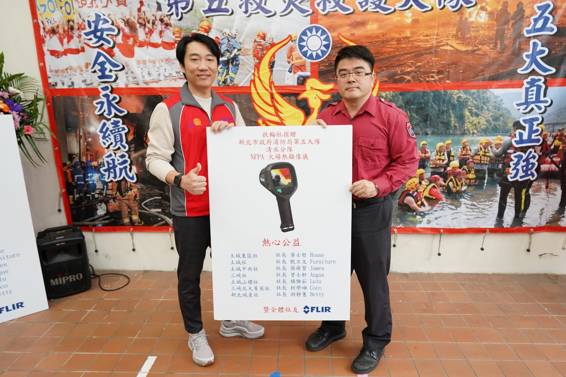 新北市消防局第五大隊大隊長高宗祺表示,近年土城地區快速發展,住宅聚落與工業區密集,火警及救災案件呈現上升趨勢,熱顯像儀能穿透濃煙協助辨識受困位置,並掌握火場熱源變化,是消防人員在高危險環境中的關鍵救援工具,有助大幅縮短搶救時間、降低事故風險。本次捐贈不僅補足清水消防分隊現階段裝備需求,也象徵社會各界對消防工作的重視與肯定,企業與社團的善舉如同後盾,讓前線同仁更加安心投入守護市民的工作。再次感謝土城東區扶輪社及各參與社友的公益行動,以及彭一書議員長期支持消防救災的付出,未來將持續與地方團體合作,共同打造更安全的生活環境。