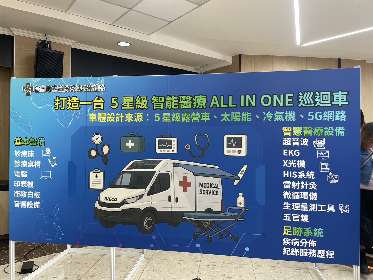 台南市立醫院通過衛福部「健康台灣深耕計畫」核定,今(八)日宣布將智慧醫療由院內推向社區,正式啟動「智慧醫療 ALL IN ONE 巡迴車」建置計畫。院長蔡良敏表示,本次補助代表國家對市立醫院科技研發與智慧醫療能量的肯定,也意味醫療服務不再受院區限制,而能真正跨入偏鄉、長照據點與民眾家門口,讓醫療平權得以落實。