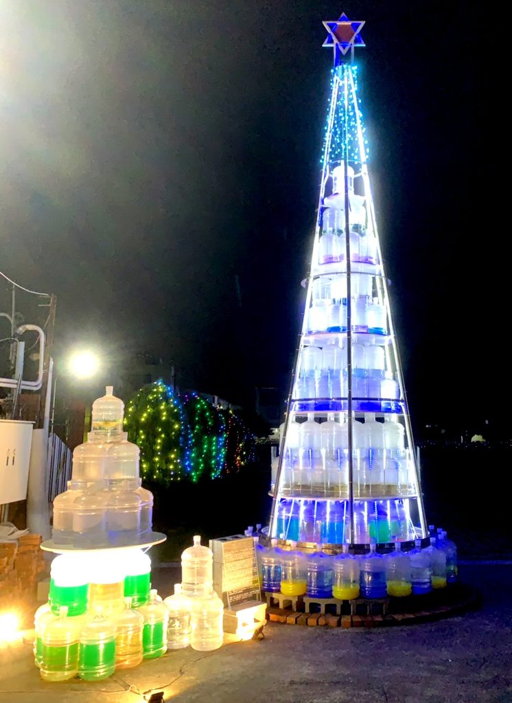 整體結構以透明飲用水瓶堆疊,瓶中灌注不同濃度的色水,呈現自下而上逐層變化的生命譜系,底層藍、綠、黃象徵水、植物、陽光的起源;中層橙與紅代表動物與人類的生命溫度;頂層無色透明,象徵氣體、雲霧與呼吸,並指向生命最純粹的狀態。光線穿透瓶體時,色水與日光交錯反射,使整體呈現出如同呼吸般的光影律動,讓此耶誕樹不只是節慶裝置,更成為一座富含寓意的環境藝術。