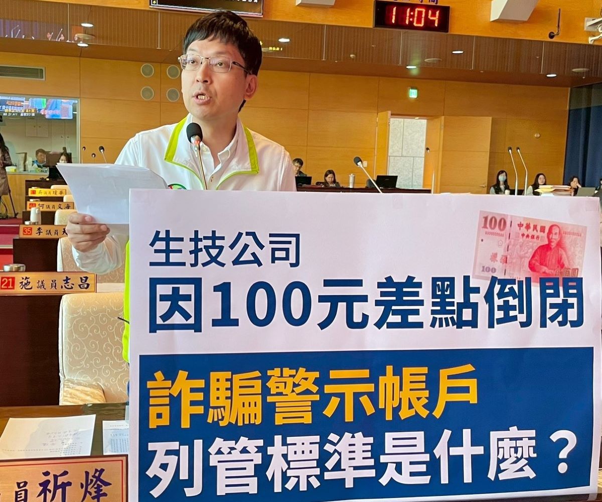 台中市議員林祈烽8日揭露一起荒謬的警示帳戶列管案件,一名民眾憑53張各匯入100元的匯款單,至派出所報案說他被詐騙,警方火速將這53個帳戶凍結,甚至連一家正常營運的生技公司都慘遭波及,列為警示帳戶後不但客戶貨款匯不進、員工薪水匯不出、外匯與支票差點跳票,公司信用面臨全面崩盤。林祈烽直言,他全力支持警方打詐,但應與金融機構做好橫向聯繫,多方確認後再凍結。