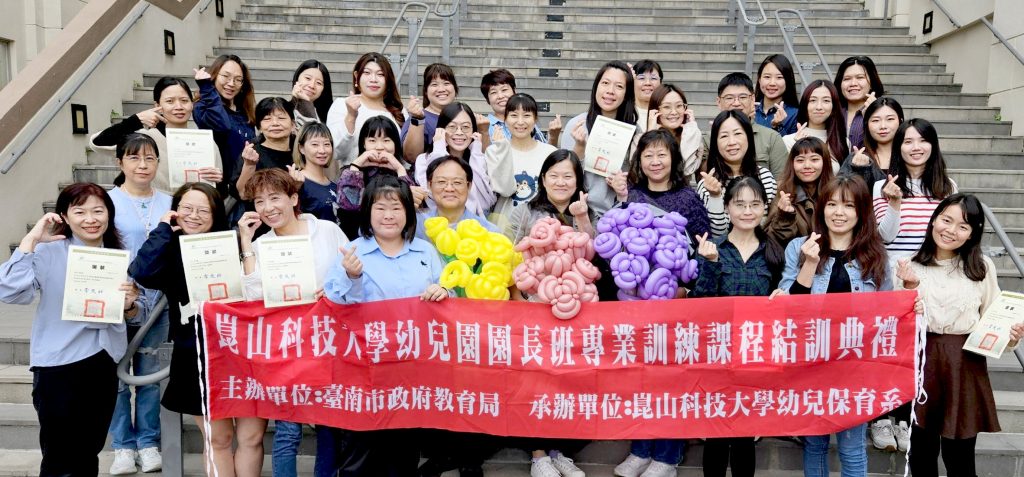 由台南市教育局委託崑山科大承辦的第十二屆「幼兒園園長專班」,卅餘位參訓學員歷時三個月完成一八0個小時的實務知能及行政實務專業課程訓練結訓,期間學員們全程投入克服挑戰,展現高度毅力與專業精神。