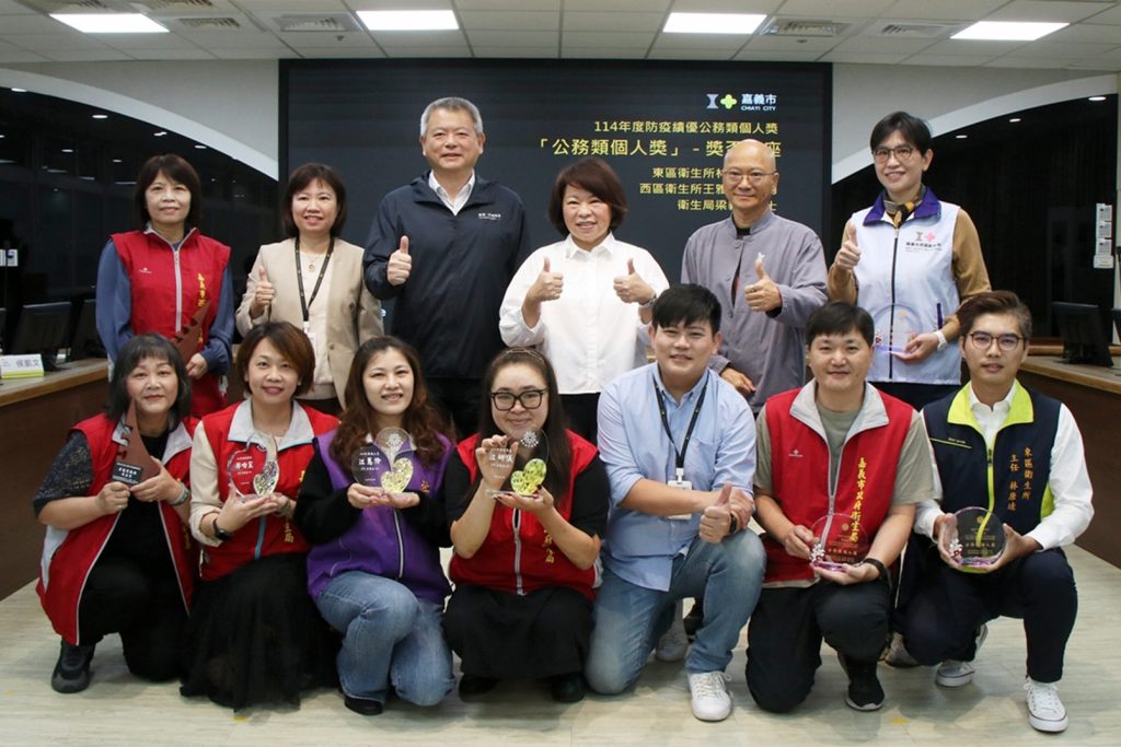 此外,疾病管制署一一四年度防疫績優個人獎,在全國眾多參選者中,嘉市亦有三位同仁獲獎,包括東區衛生所主任林唐逵、西區衛生所醫檢師王雅慧,以及衛生局技士梁義慶。