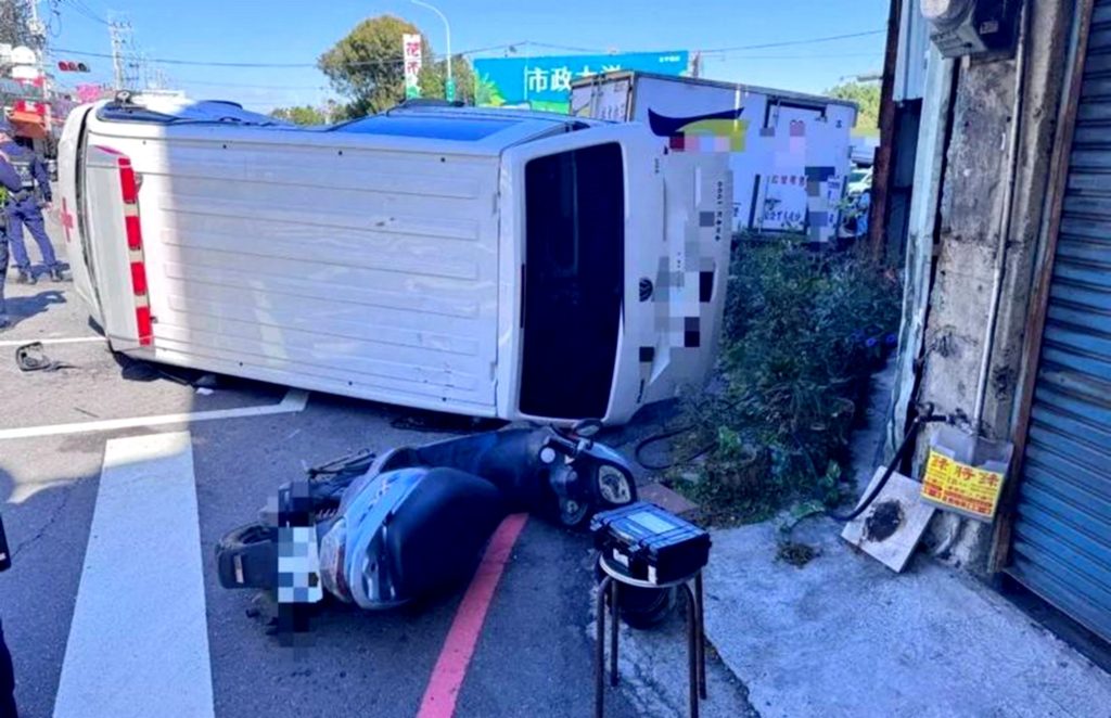 台中市四十歲蕭姓男子八日上午駕駛救護車要到台中監獄培德醫院載病患,行經南屯區忠勇路、五權西路三段時闖紅燈,當時救護車有鳴笛、閃燈,不過由吳男駕駛的貨車沒注意到,行經路口時撞上救護車,將救護車撞到側翻,也波及到另名機車騎士,一共造成四人受傷,三人送醫,詳細案發原因待查。
