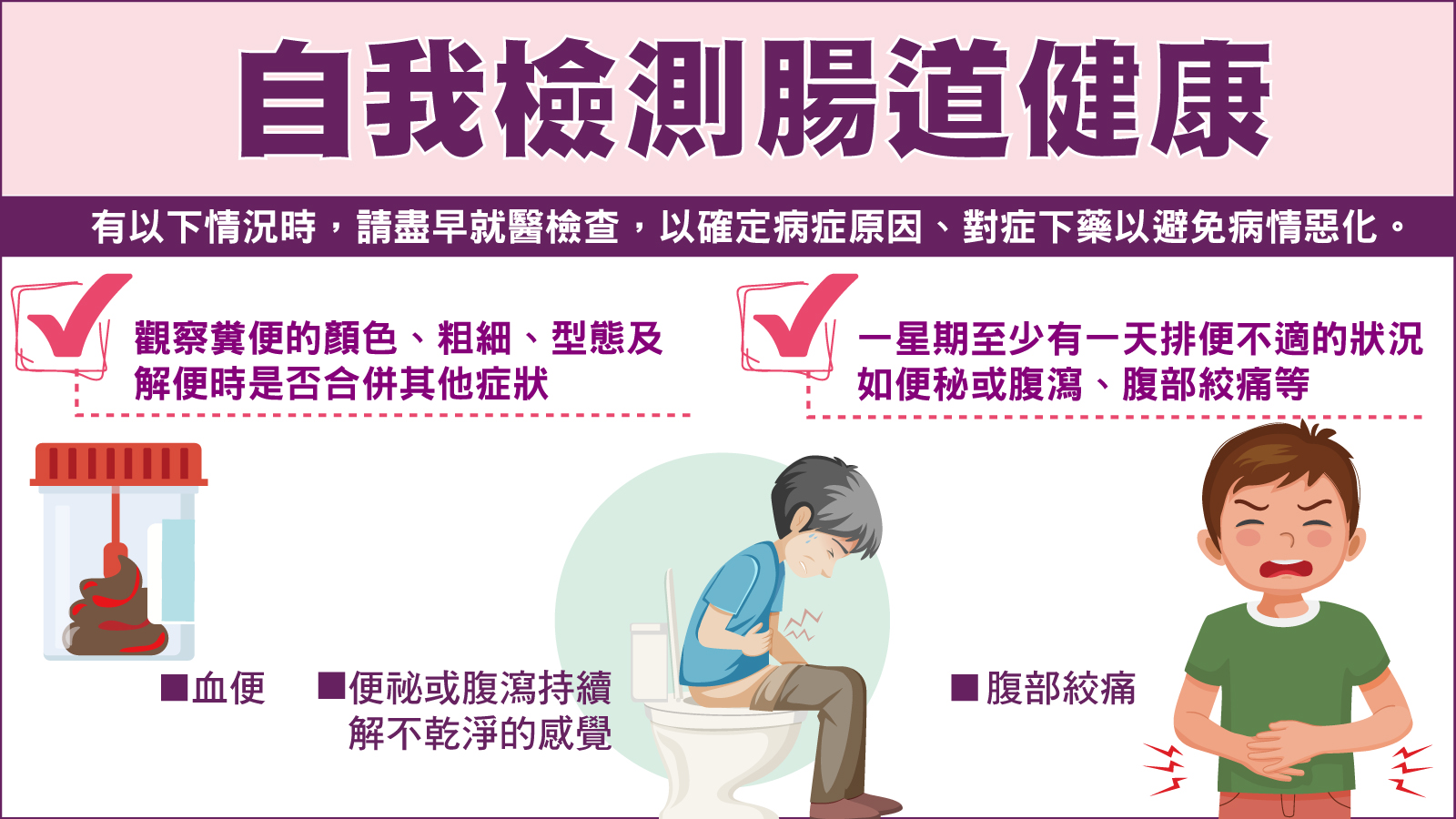黃任嫻指出,每次如廁後都應進行自我腸道健康檢測,正常人1-3天排便一次都屬正常,民眾不宜過度在意排便的次數,重要的是觀察糞便的顏色、粗細、型態,以及解便時是否合併其他症狀。