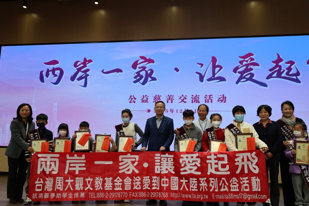 周大觀文教基金會永續跨海力挺兩岸癌童活出希望,今(9)日在上海市台辦及上海市兒童醫院協助下,由創辦人周進華、董事長郭盈蘭帶領血癌單親食品工程師蔡宗憲、全盲多藝勇士周軒瑋等台灣生命鬥士一行15人,跨海頒發抗癌圓夢助學金,同時向醫護人員致敬,並由周大觀小星星樂團義演寶島台灣民謠,還分送每位癌童禮物與周大觀遺作《我還有一隻腳》,讓白色病房染上快樂色彩,大家一起把兩岸一家.讓愛起飛的正能量傳出去。