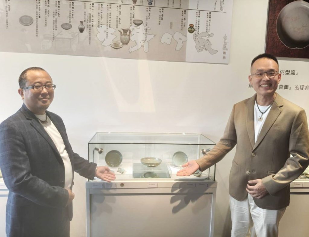 收藏家陳柏磬(右)、洪銘廣特別推薦一賞首次在台公開展出之〈文會圖〉中描繪的「桃型盤」實物。(記者楊文琳攝)