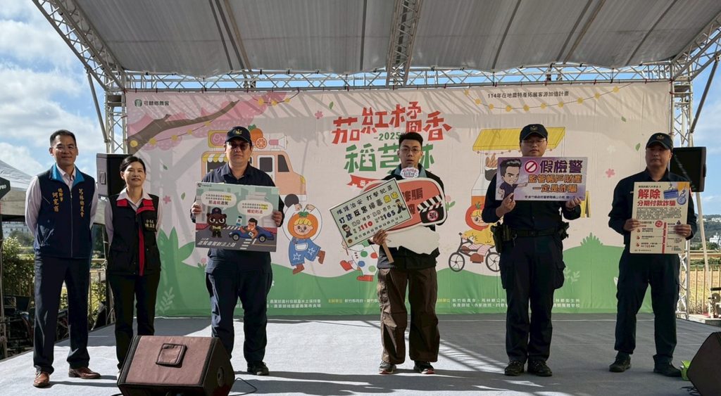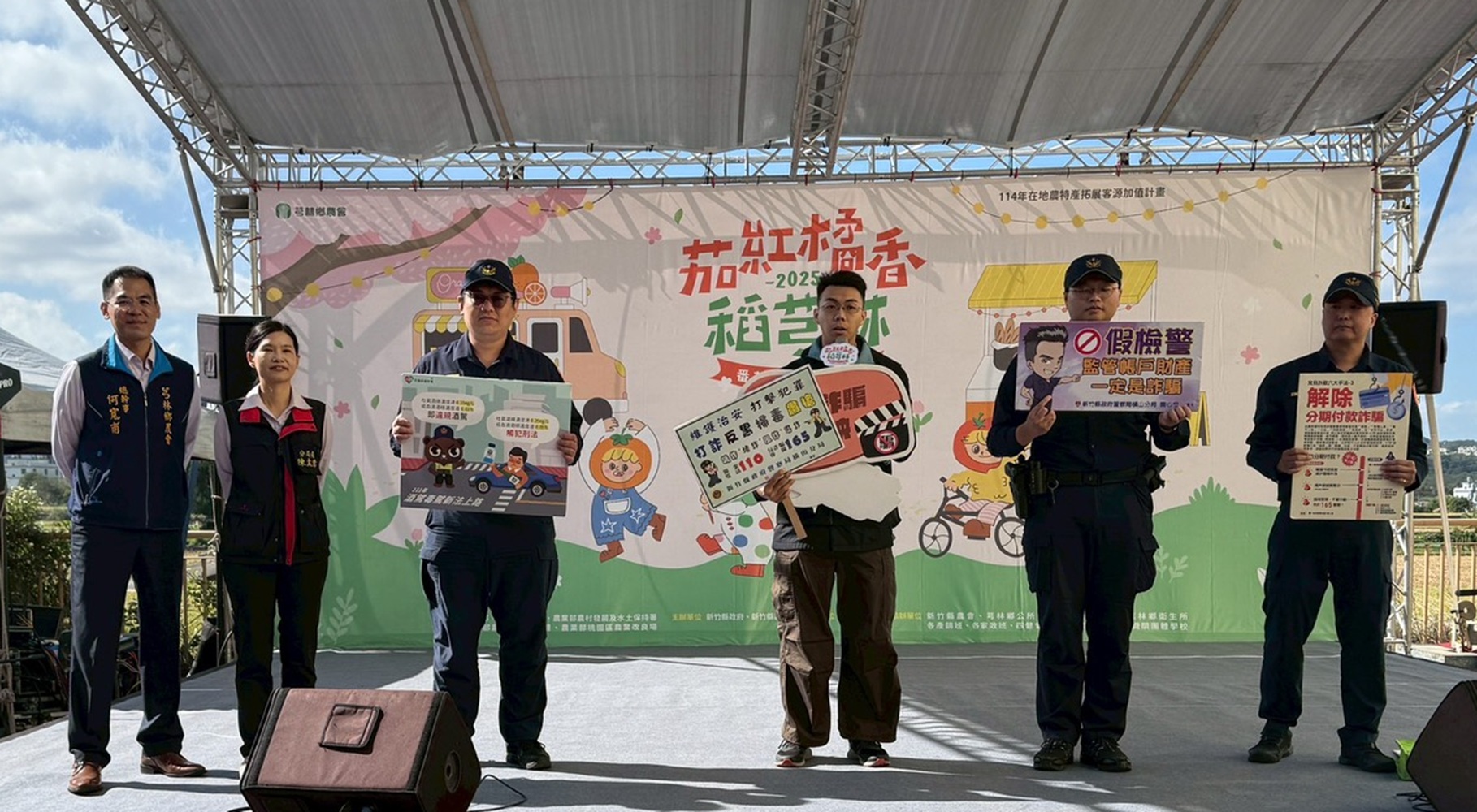 竹縣芎林鄉農會日前舉辦茄紅橘香稻芎林番茄產業文化活動,橫山警分局長陳孟君與同仁共同登台,向前來參與活動的民眾進行反詐騙及反毒駕等治安、交通安全宣導,讓反詐交安更深入鄰里。