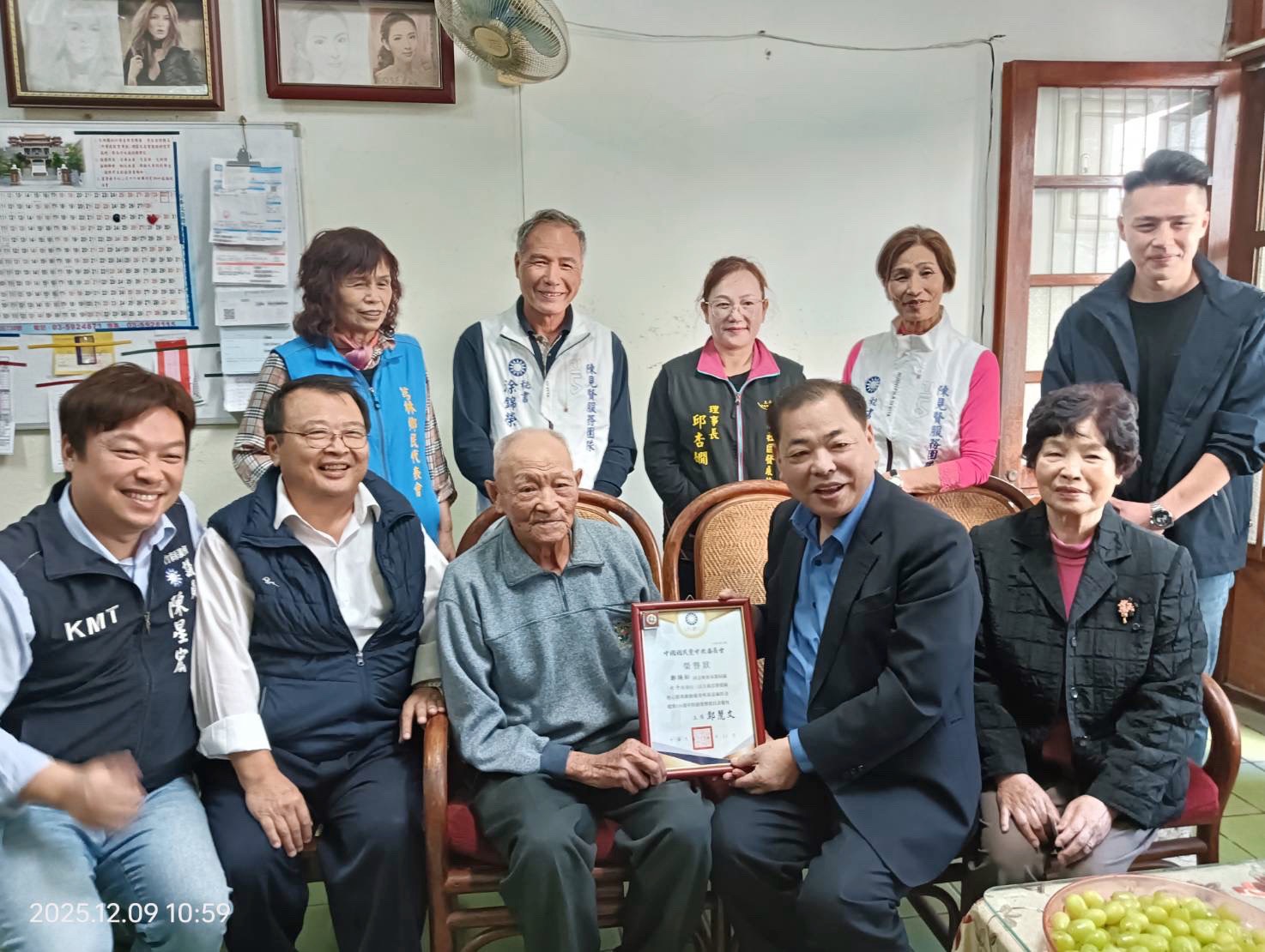 陳見賢表示,國民黨以「民有、民治、民享」為核心精神,縣黨部將持續與黨中央緊密合作,推動各項黨務革新,讓基層聲音能夠真正傳遞到政策端。九十二歲的鄭煥松,出身務農家庭,年輕時除務農外,亦在大華科技大學(現敏實科大)兼任工藝教師,指導學生種植蔬菜、花卉,並以修補舊桌椅、製作工藝品的方式,推動惜物精神與創意教育。鄭老師更擅長人物素描,筆下人物生動傳神,多次替政要繪畫,深獲肯定。