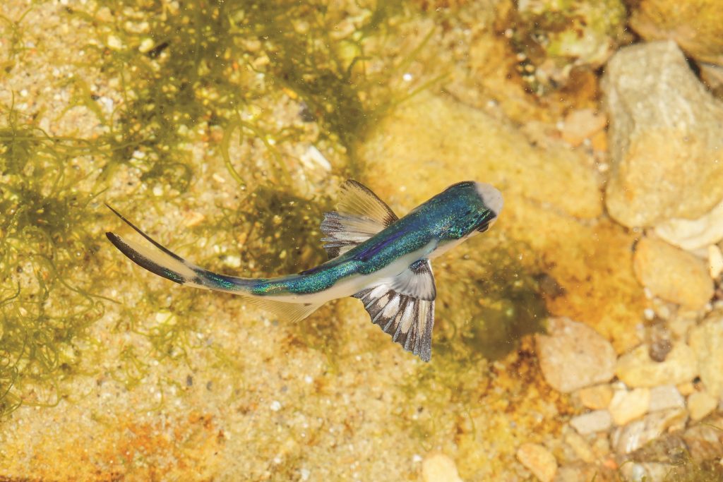 海科館研究典藏組主任陳麗淑說明,圓鯧身形扁平、呈銀白色,胸鰭與腹鰭明顯延伸成「雙鰭」外觀,是其俗名來源,也是被誤會為小飛魚的原因。幼魚可在僧帽水母觸手間穿梭,利用僧帽水母的毒性防護避開掠食者,為與僧帽水母高度共生的物種。