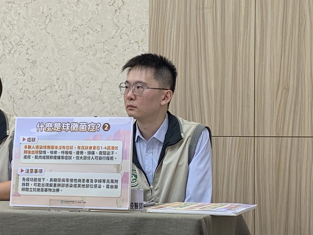 防疫醫師李宗翰表示,個案為北部地區50餘歲本國籍男性,疾病暴露期間無國外旅遊史,於8月初出現倦怠、咳嗽、呼吸喘等症狀後就醫,後續肺部相關檢體經培養確認為球黴菌。個案目前經服用抗黴菌藥物治療後,症狀已明顯改善,經衛生單位追蹤職場接觸者健康狀況,目前皆無相關症狀。