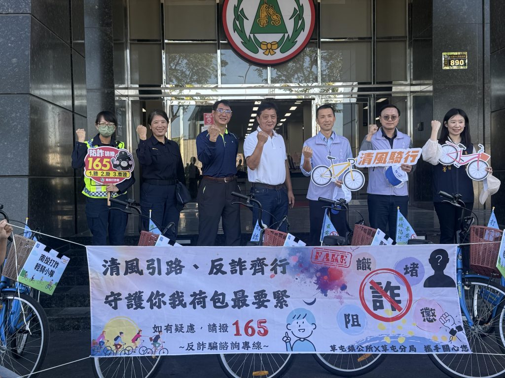 為提升民眾反詐騙意識,守護在地治安,草屯鎮公所政風室十日上午與草屯分局共同辦理「清風騎行」反詐騙宣導專案,由南投縣政府政風處鍾副處長及草屯警分局副分局長吳碧芬領軍,帶領公所同仁騎乘腳踏車,以行動走入市區、深入市井巷弄,呼籲民眾提高警覺、拒絕詐騙。