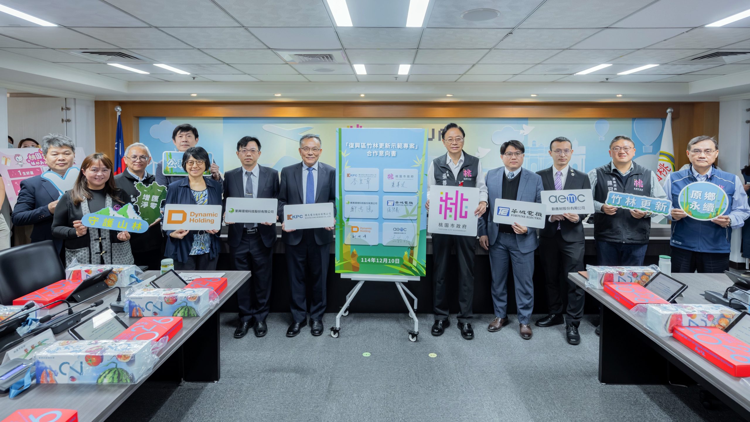 桃園市長張善政十日與企業簽署「復興區竹林更新示範專案」合作意向書。張善政表示,市府與五家重視永續與環保的企業共同簽署「復興區竹林更新示範專案合作意向書」,正式啟動桃園首座由企業共同投入的自然碳匯案場。張善政表示,此次由市府與企業攜手,推動具示範性的竹林更新示範專案,以公私協力治理模式邁向永續桃園目標,共創環境與經濟雙贏。