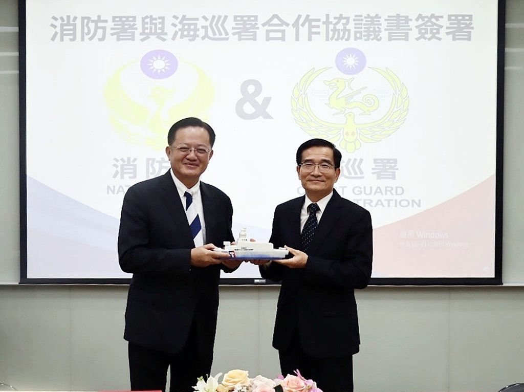 為強化台灣水域安全與災害應變能力,消防署與海巡署於十日在海巡署教育訓練測考中心舉行合作協議書簽署儀式,由消防署長蕭煥章與海巡署長張忠龍代表簽署。未來雙方將在水域救生、公共安全潛水、無人機應用及緊急救護等四大面向展開深度合作,並建立教育訓練交流平台。