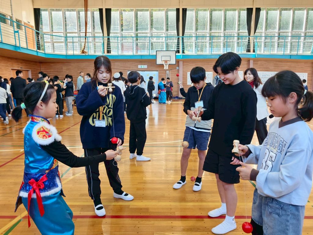 社子國小第一天前往大網白里市立瑞穗小學展開交流,活動以全日語介紹台灣與家鄉特色開場,展現半年來扎實的語言訓練。學生接著帶來結合台灣廟會鼓樂與日本童謠〈桃太郎〉的鼓樂組曲,贏得全場掌聲;瑞穗小學則以節奏整齊、技巧純熟的花式跳繩回應,讓同樣推動跳繩運動的社子學生深受鼓舞。其後兩校學生共同體驗劍玉、翻花繩、沙包、板羽球等傳統童玩,並於午餐後一同進行書法課程,在輕鬆愉快的氛圍中深入感受日本文化。