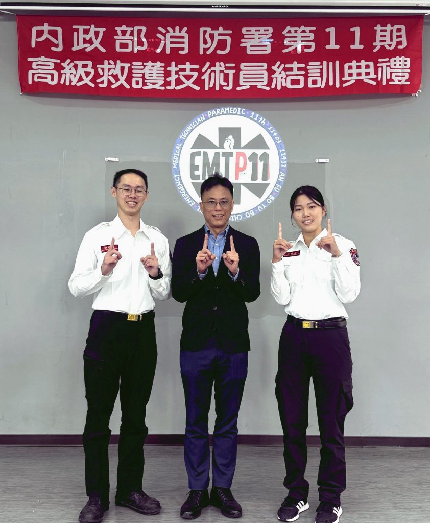 高雄市消防局中華消防分隊隊員黃子寧(右)與六龜消防分隊隊員盧建豪(左),參加內政部消防署「第11期高級救護技術員(EMT-P)訓練」,分別以總成績第1名及第3名的優異成績結訓,圖中為緊急救護科長陳俊宏。