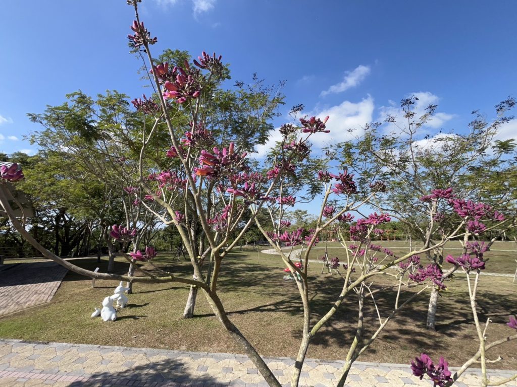 南化區南化遊客中心喜迎春,今年三月才種下的紫紅風鈴木,竟然花開滿樹梢,讓遊客驚豔在冬季裡竟喜見滿樹春意。中心主任林志漢表示,今年三月遠東百貨特別選在南化遊客中心種樹,種下六棵紫紅風鈴木,悄悄開花了,讓到中心的遊客驚喜不已。