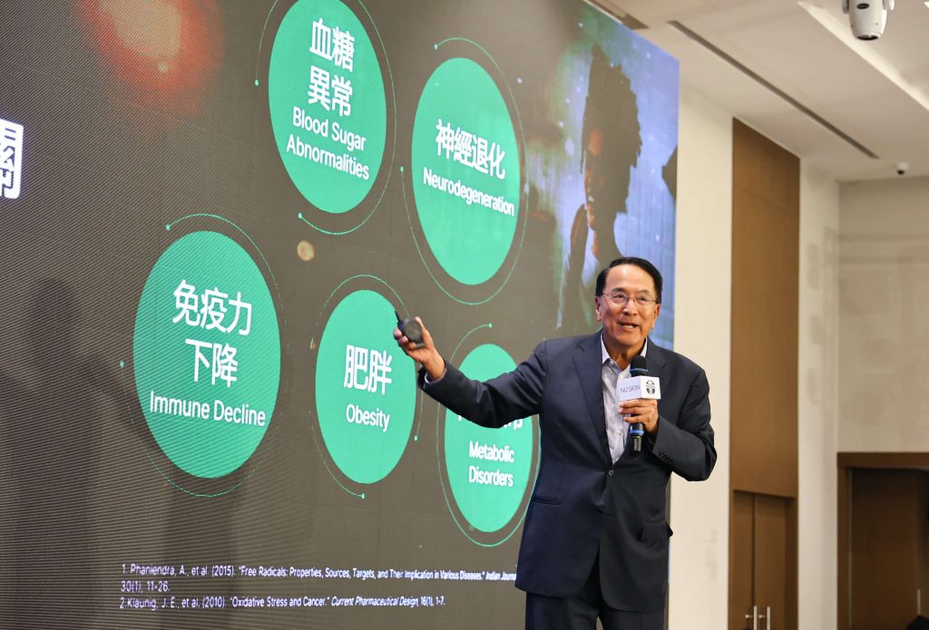 Nu_Skin_抗老科研顧問團主席曾潤海博士指出90%的健康問題都與自由基有關,包含:血糖異常、神經退化、免疫力下降、肥胖、代謝異常等。