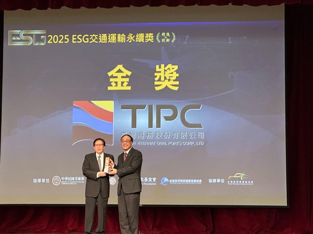 臺灣港務公司以港埠低碳轉型、社會共榮與智慧韌性為核心,持續推動港口永續發展,今(114)年以「高雄港第七貨櫃中心」的卓越永續作為,再度榮獲第二屆「ESG交通運輸永續獎」金獎肯定,並於交通部集思會議中心舉辦的盛大頒獎典禮,由臺灣港務公司周永暉董事長出席受獎,展現港務公司長年在交通運輸永續領域的創新作為與具體成果。