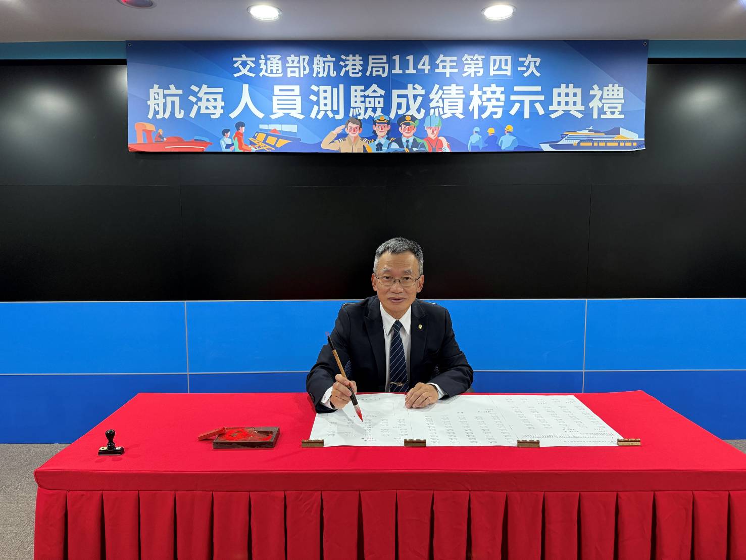 交通部航港局114年第四次航海人員測驗榜示,共計134人合格,合格率達兩成,附圖為交通部航港局副局長劉志鴻主持點榜及本次航海人員測驗成績榜示典禮督導委員合影。(航港局提供)