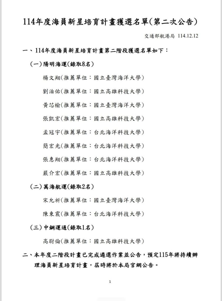交通部航港局公布114年海員新星 1.0 第二階段入選名單,航港局副局長劉志鴻主持114年「海員新星培育計畫」公布第二階段獲選名單,共計有11名學生入選,自計畫推動至今,於今年度累計錄取人數已突破百人,成為「小海星」的學生們將成為我國海運產業的未來新星。(見附表及圖,航港局提供)