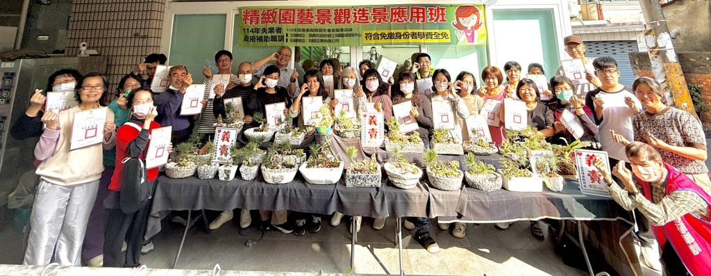 台南市政府勞工局職訓就服中心委託伽碩職訓中心辦理「精緻園藝景觀造景應用班」,十二日舉行成果發表會暨義賣活動,現場展出多件融合盆景藝術與生態設計的創意植栽作品,並同步進行作品義賣,讓學員將學習成果轉化為實際行動,回饋社會、傳遞善意。