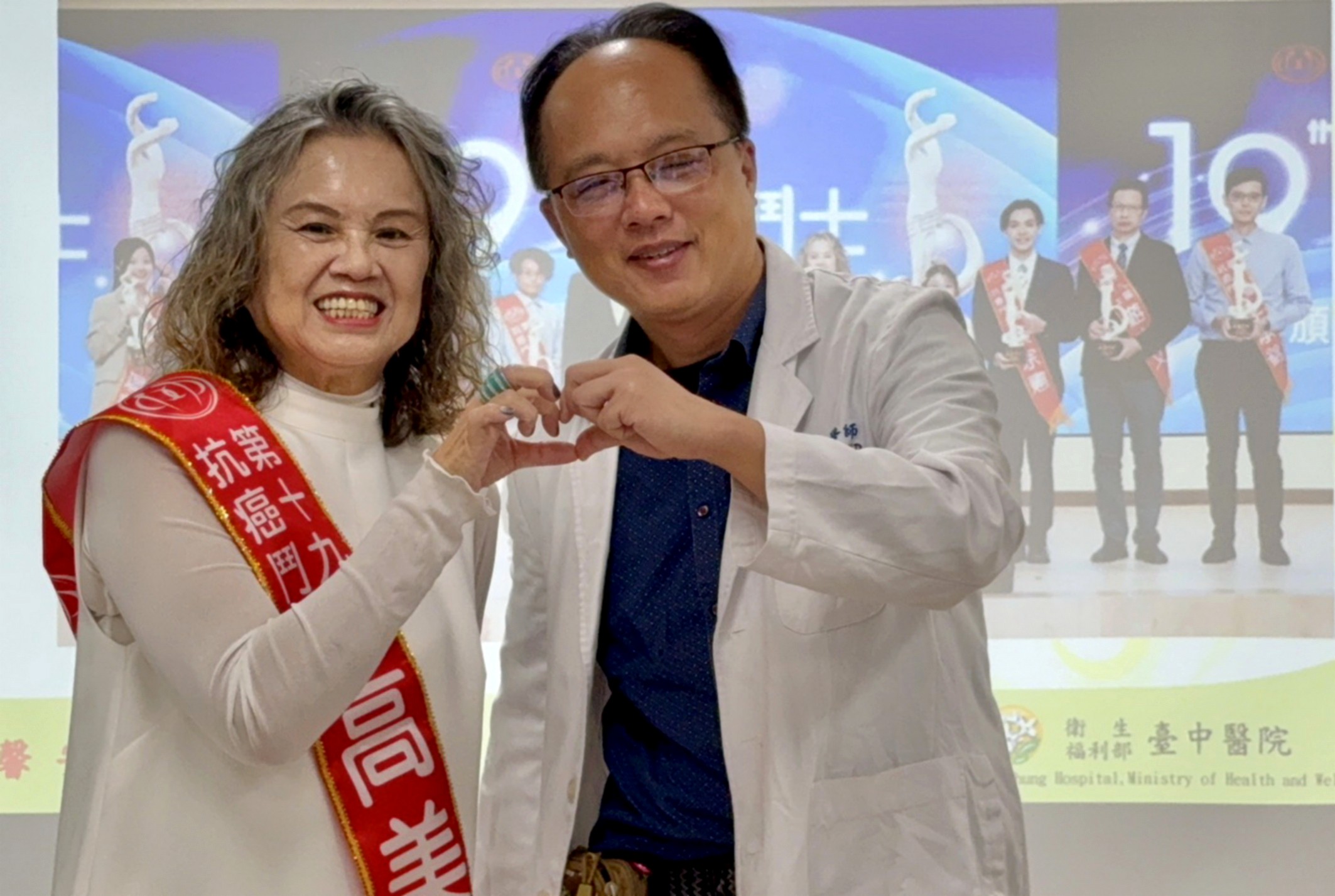 一路陪伴抗癌的台中醫院癌症中心團隊、血液腫瘤科醫師陳駿逸昨日特別出席活動,幫高美鳳姐披上十大抗癌鬥士的彩帶,高美鳳則拿出十大抗癌鬥士的獎章,跟美麗人生乳癌關懷俱樂部姊妹們合影,分享得獎喜悅。