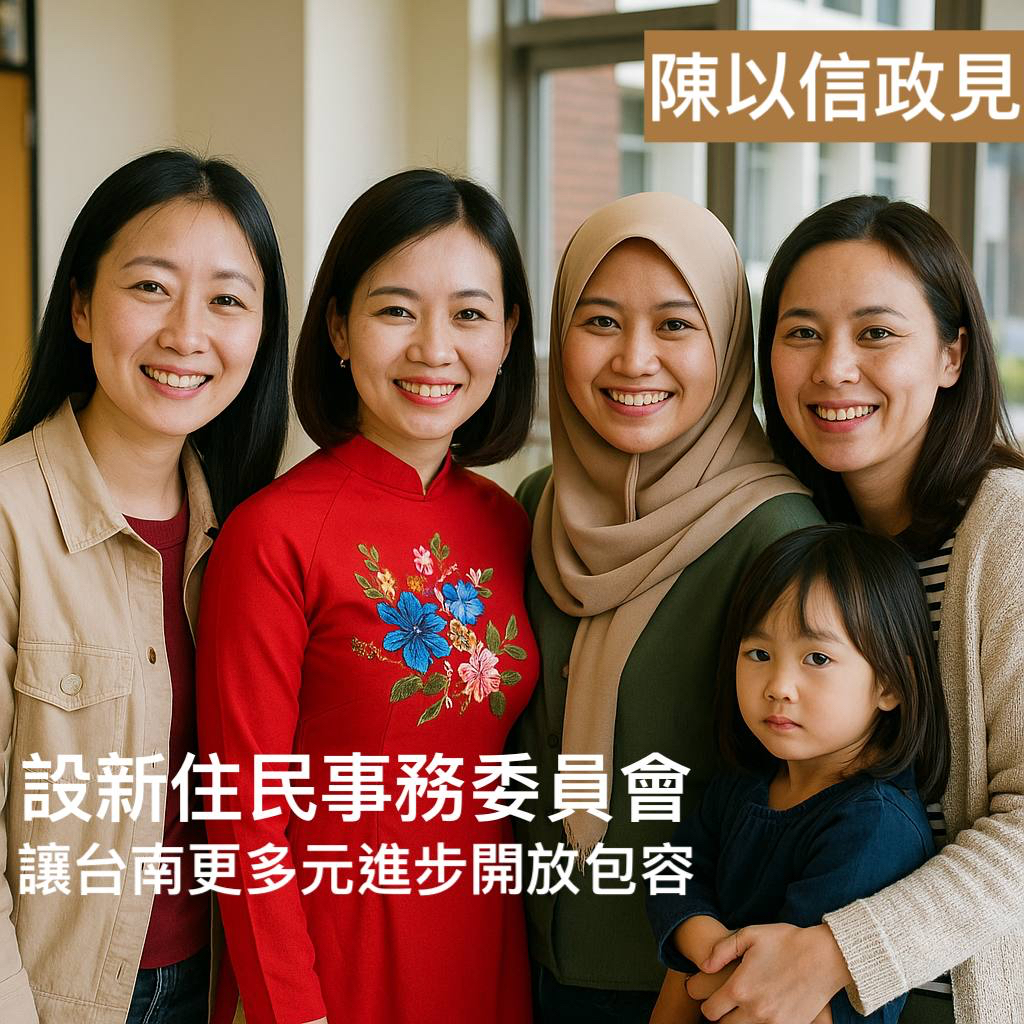 台南目前有三萬多名新住民,在地方就業、納稅,也在台南成家育兒,成為「新台南人」,但長期以來,在市府決策體系聲音相對微弱。爭取角逐台南市長的前立委陳以信主張成立「新住民事務委員會」,未來由市長親自召集,專責統籌新住民事務與福利政策,並讓新住民代表參與市政決策,作為中央與地方對接新住民政策與資源的平台。