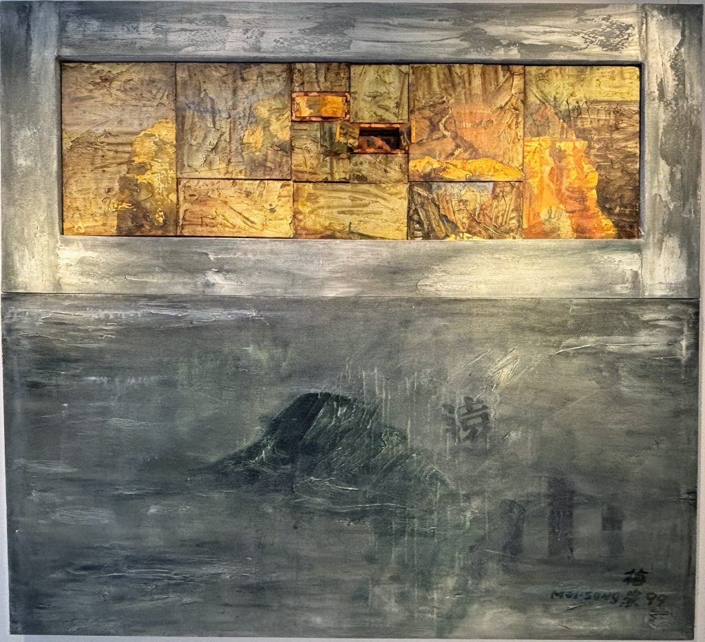 吳梅嵩校長的作品富有深厚的文學性及詩學,在二0二二年《抽象高雄》展覽時,曾展出《旅行紀念品-大峽谷與遠山》這件作品,當時有小孩問說,為什麼作品上面要開兩個窗戶,他回答說,那是小小的櫥櫃,裏面放著「光陰」,由此可見他相當富有詩意。從藝術家轉換為教育家,他的作品背後是一段段生命行旅的累積,從國外求學到返台參與南台灣前衛藝術推廣活動,再到中華藝校服務,就如他曾所述「不論是一片舊牆,或是一塊仍殘留粉筆書寫痕跡的黑板,有時也會突然出現一些人為的塗鴉,這些記號,常令人想起當日時光種種,深深烙印在與他一起同行的時空記憶中。」