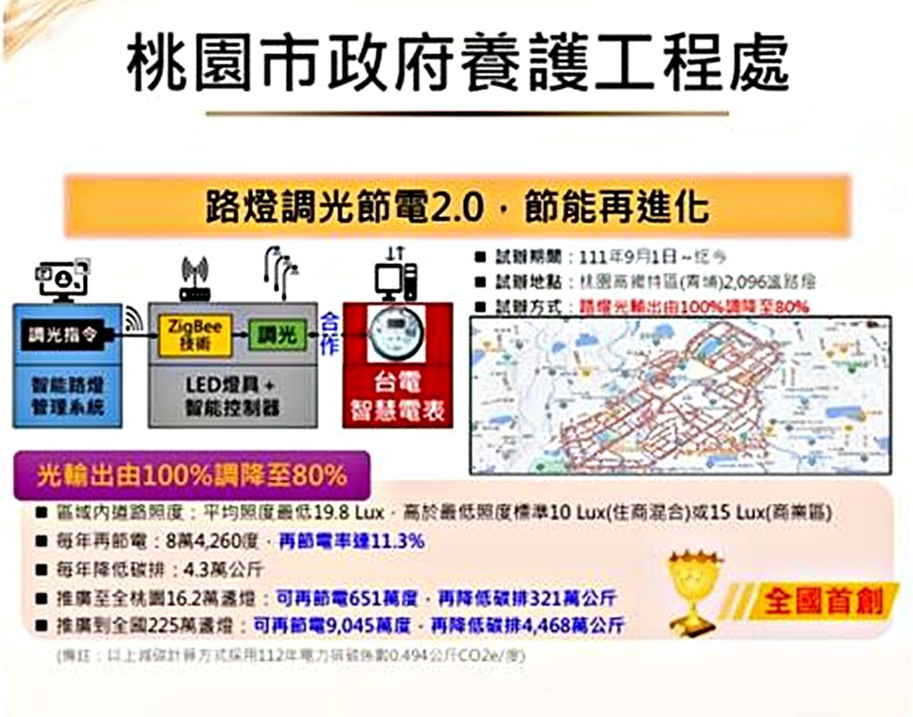 在智能應用方面,桃園市將十六.二萬盞路燈全面升級為LED智能路燈。養工處建置的智能管理系統具備「全國首創路燈應用專利Auto-healing技術創新」,能主動監測故障並派工,將路燈平均修復時效從四十八小時大幅縮短至十五小時以內,維護效率提升高達百分之三百二十。