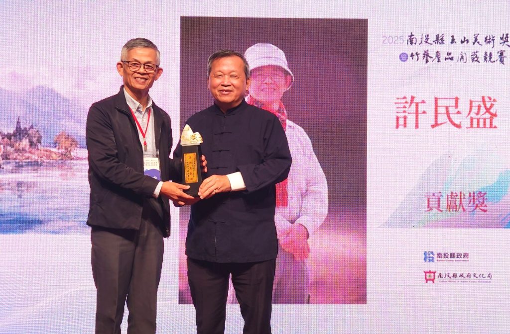 南投縣文化界盛事─玉山美術獎十三日頒獎,至高榮耀貢獻獎由許民盛榮膺;許民盛投入藝術創作、教育推廣與社區文化參與長達五十年,退休後仍不遺餘力推動藝文活動,以書畫回饋社會。而今年特別增設的兩名玉山獎,由水墨膠彩類首獎吳惠淳與工藝類首獎王子齊脫穎而出,兩人分別獲頒二十萬元獎金。