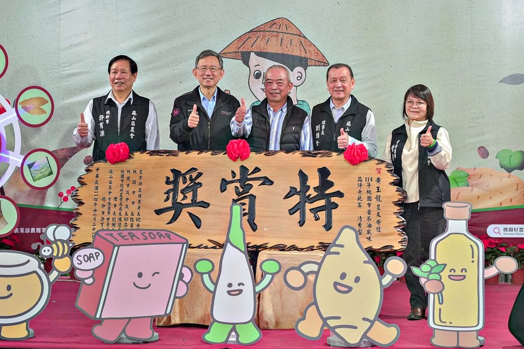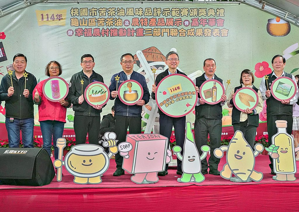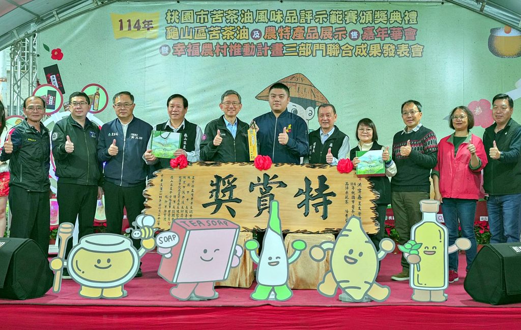 一一四年桃園市苦茶油風味品評示範賽頒獎典禮、龜山區苦茶油及農特產品展示(售)嘉年華會暨幸福農村推動計畫三部門聯合成果發表會在龜山區農會舉行。農業局表示,桃園苦茶樹種植面積近一百六十公頃,市府去年首度辦理示範賽,有一百三十四點參賽,今年大幅成長至二百零五點。