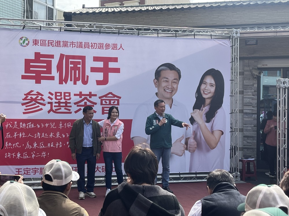 台南市東區目前僅有一席民進黨籍市議員,立委王定宇根據國會的綠營為弱勢政黨的現況,毅然決然推派服務處主任卓佩于出馬,爭取第二個席次,十三日舉辦盛大的宣布參選茶會,除了卓佩于的長榮中學、成大碩士班師長和親友,更有立委林楚茵、東區逾半里長到場,現場更湧進七百位鄉親,齊聲為卓佩于初選出線加油打氣。