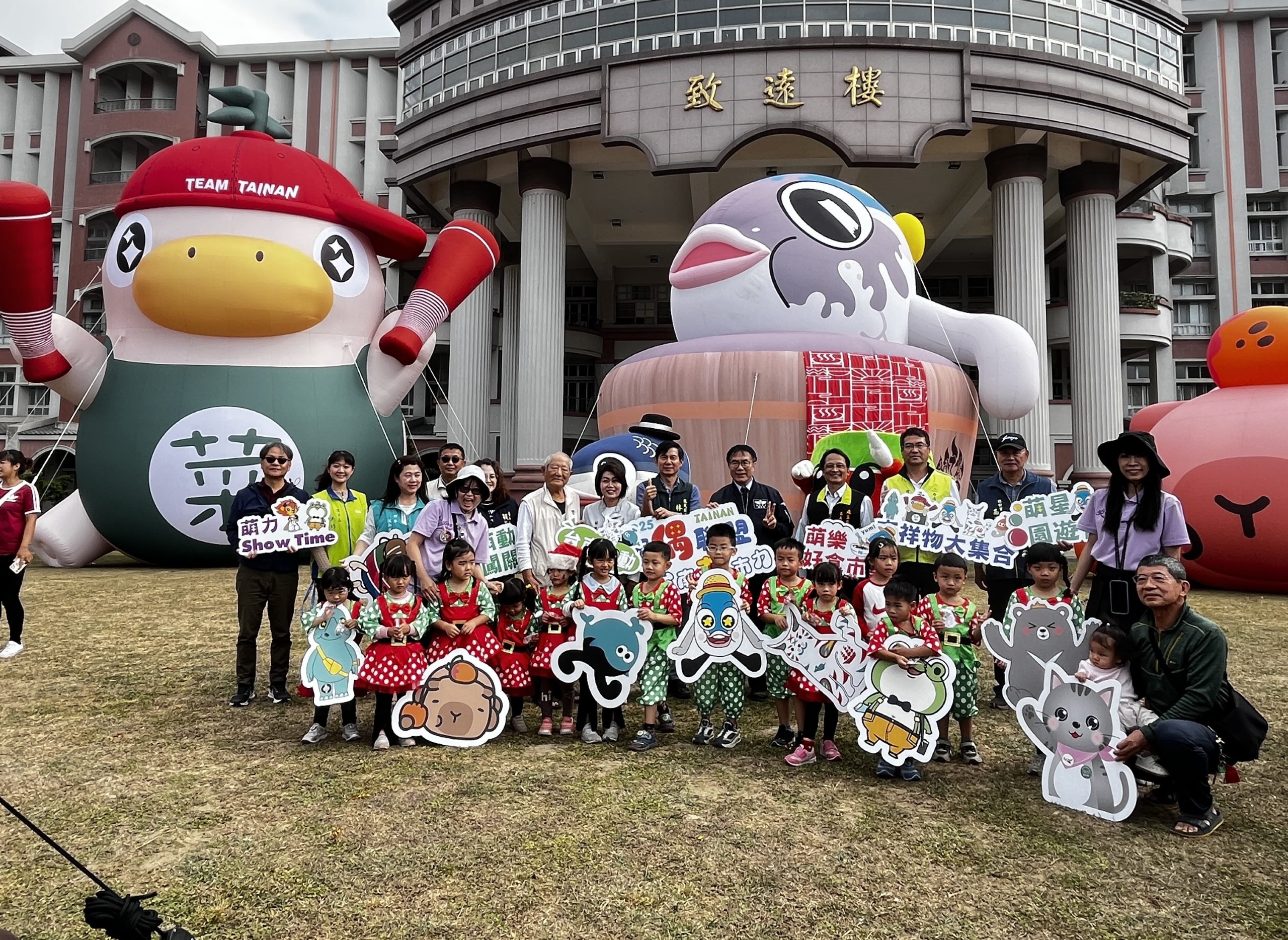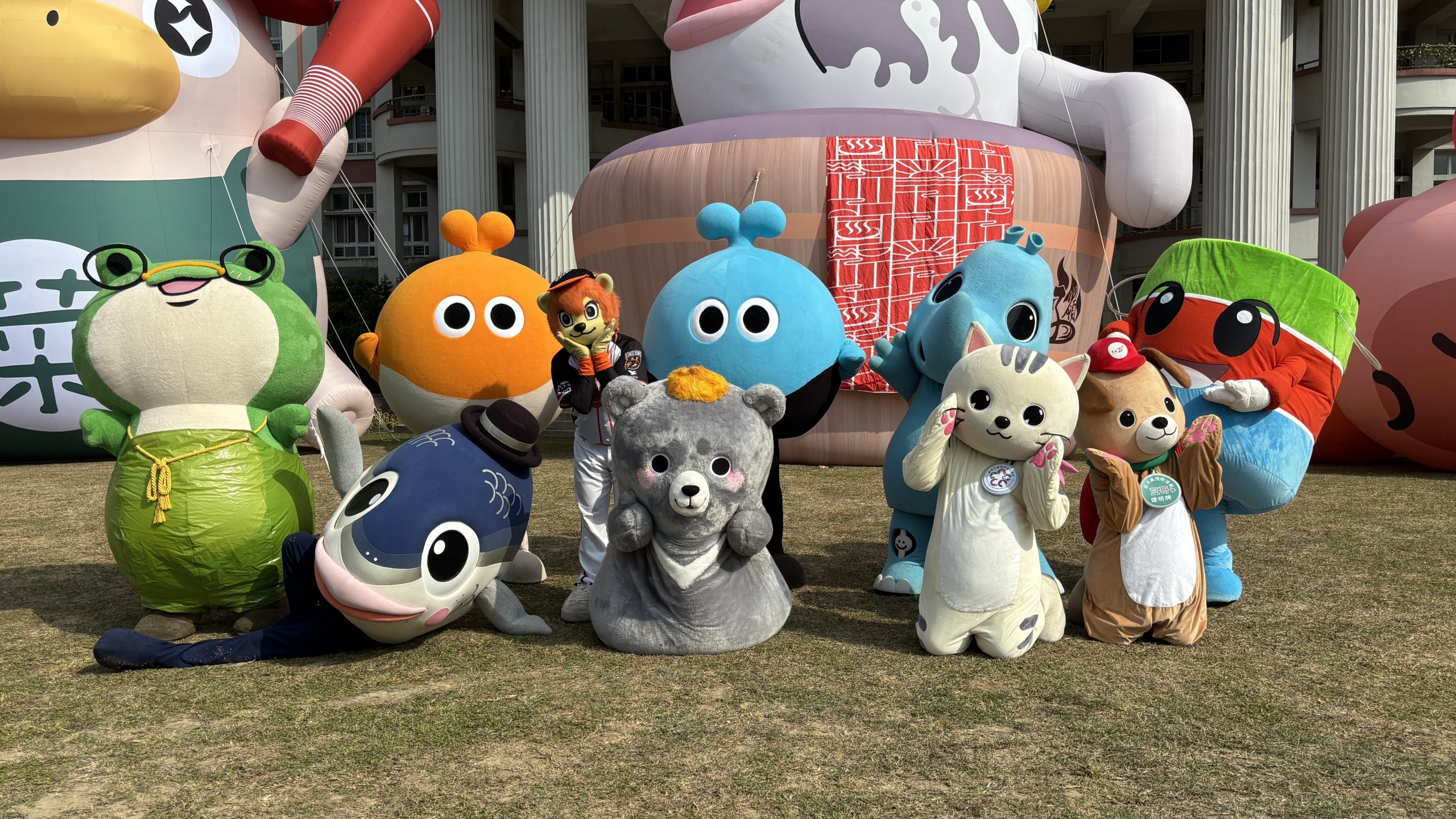 觀旅局集結「魚頭君、菜籃仔、大員與甜甜、豆哥與凱娣、蛙寶、KOKO、統一獅萊恩、灰熊熊」等台南超人氣萌星,十三日在曾文願景園區首度合體亮相,吸引親子目光,現場嗨翻天。