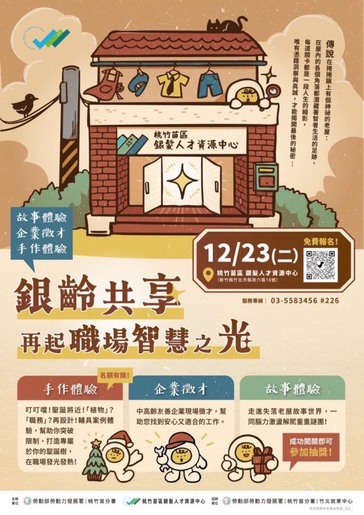 為協助中高齡者順利重返職場,勞動部勞動力發展署桃竹苗分署將於廿三日在竹北銀髮人才資源中心舉辦「銀齡共享-再起職場智慧之光」,活動主軸鎖定「媒合就業」與「職場優化」兩大面向,活動採線上報名,歡迎民眾踴躍參加。