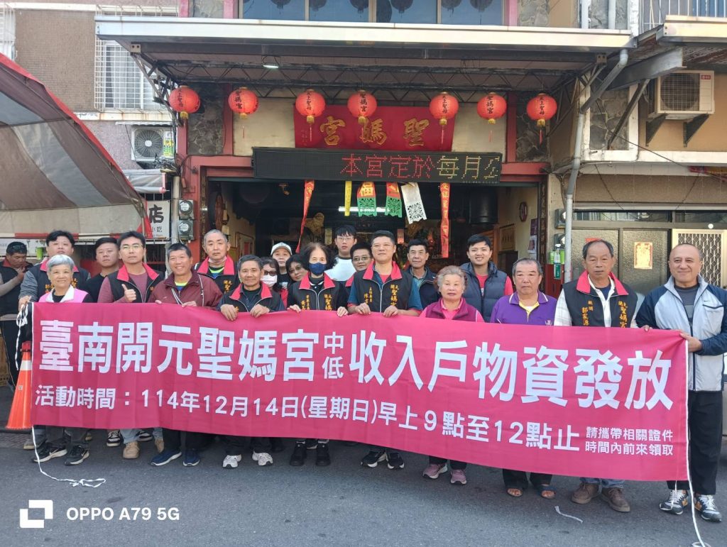 台南開元聖媽宮十四日由榮譽主委黃美雲、主委陳韋翰、總幹事吳世雄暨全體委員帶領信徒進行中低收入戶物資發放。