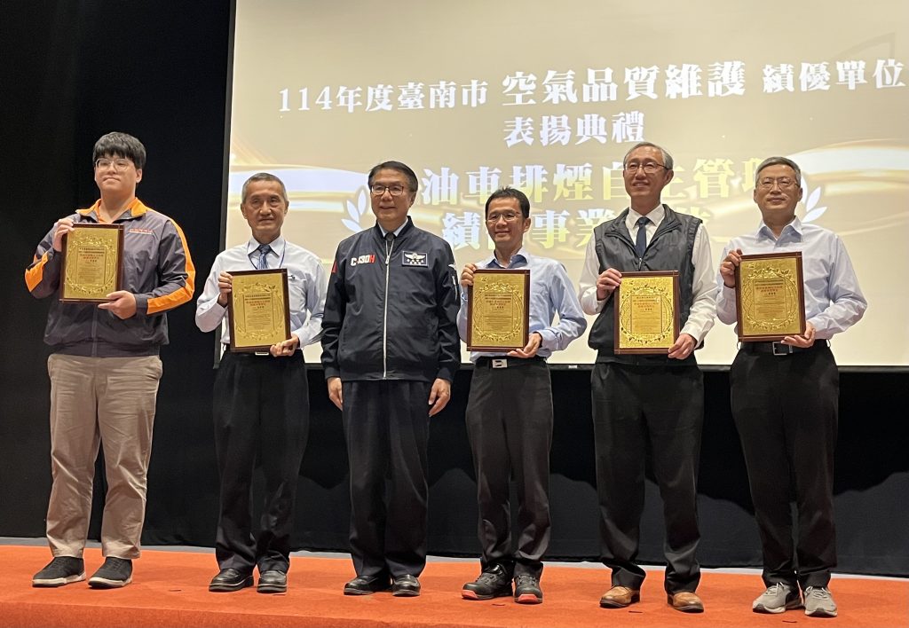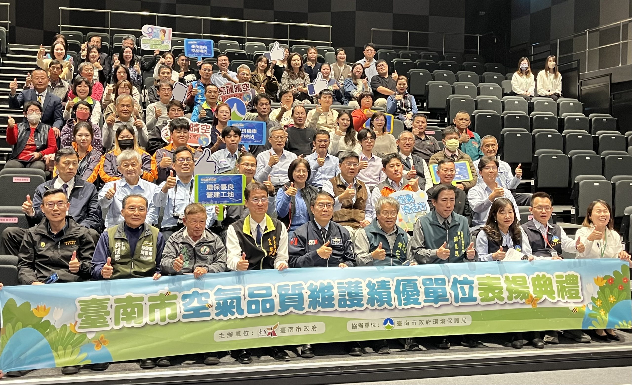 台南市政府環保局日十五在台南市美術館二館舉行「一一四年度空氣品質維護績優單位表揚典禮」,由市長黃偉哲親自頒獎,表揚卅八個在空氣品質改善上表現突出的單位,涵蓋營建工地、交通運輸、企業、校園與社區等多元領域,展現台南推動空品治理的整體成果。