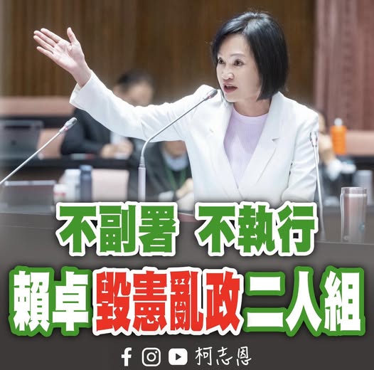 國民黨立委柯志恩十五日痛批,卓榮泰院長嗆聲面對立法院三讀通過的法律,以「不副署、不執行」的方式對抗,公然癱瘓憲政運作,卻甩鍋立法院違憲擴權,如此黑白顛倒、專斷蠻橫,更儼然形同對立法權宣戰,賴卓二人已成為毀憲亂政的罪人!