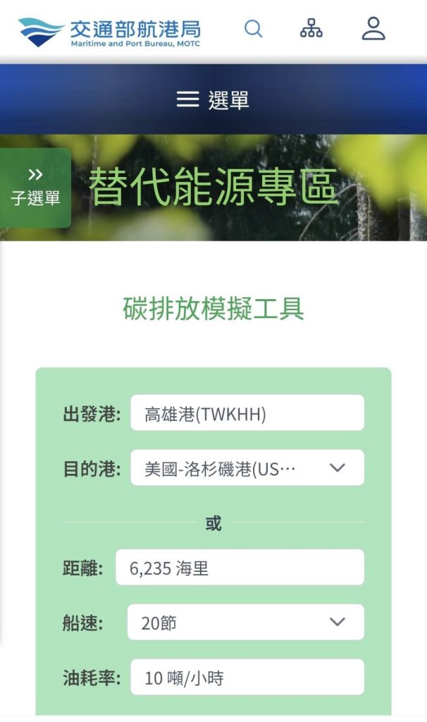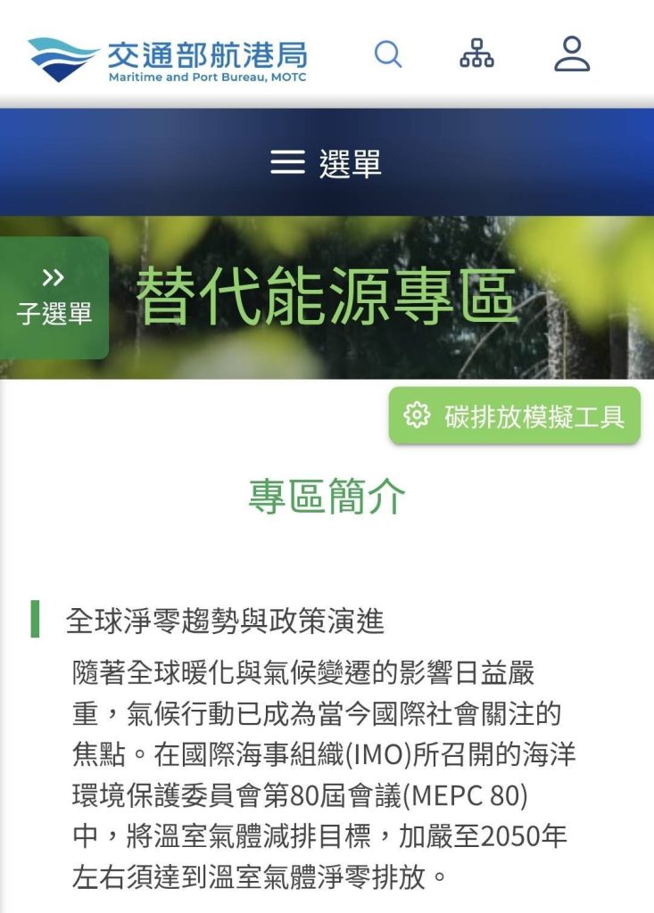 航港局說明指出,「替代能源專區」涵蓋七大主題,其中,「替代能源介紹」係以簡明方式,引導使用者快速了解目前重要的替代能源類型;「國際趨勢與發展」呈現全球減排政策、技術演進與國際市場變化;「臺灣政策與實踐」揭露國內海運減碳策略、政府推動成果與產業綠色布局;「世界燃油價格」有利產業評估營運成本與發展能源策略;「產業動態與新聞」係最新市場資訊與國際事件的匯流場域;「教育資源」整合了國內外相關研討會與課程資訊,促進海運產業在永續議題上的培力;而「碳排放模擬工具」更是專區的一大亮點,該工具為航港局所舉辦之「航港大數據創意應用競賽」得獎作品落地應用成果,使用者可針對9種燃料,依所選(填)之船舶航行距離、船速及油耗率等,模擬其油耗與碳排放的變化,藉此能更清楚了解,替代燃料對於海運減碳的實際效益,增進永續轉型的實務認知。
